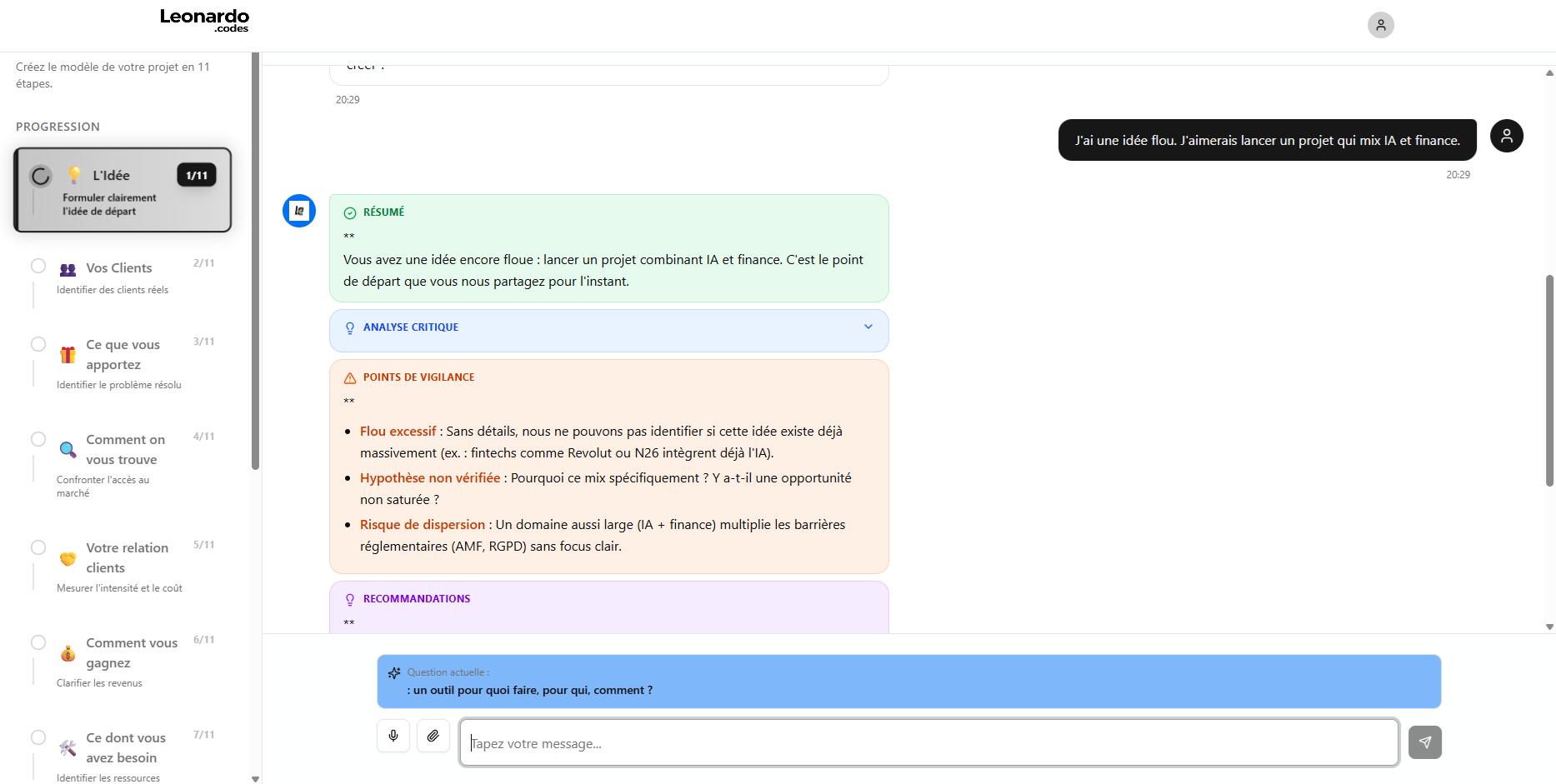 Leonardo te guide étape par étape, te pose les bonnes questions et transforme ton idée en projet structuré, sans que tu te perdes ou que tu bloques.