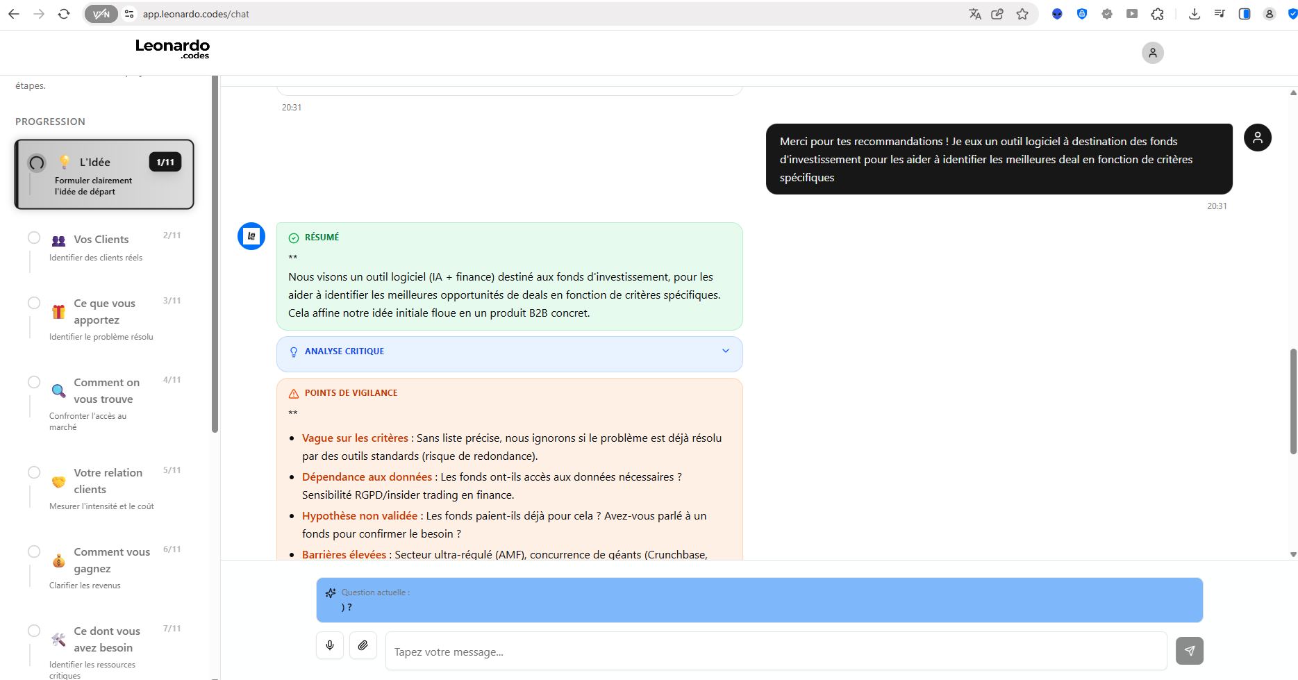 Leonardo ne te laisse pas rester dans le flou. Il remet en question ton idée, te pousse à préciser, et t’oblige à structurer ce que tu veux vraiment construire. Tu passes de “ça pourrait marcher” à quelque chose de clair, logique et cohérent.